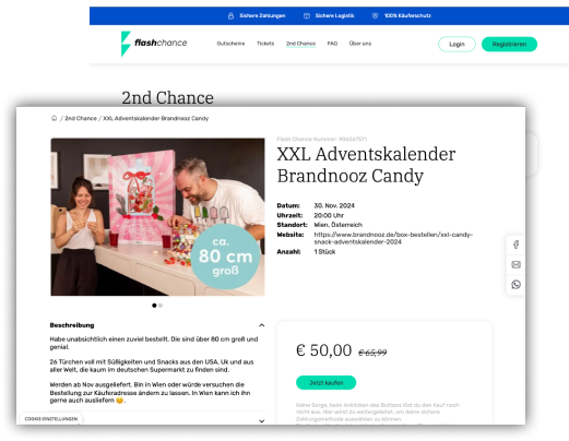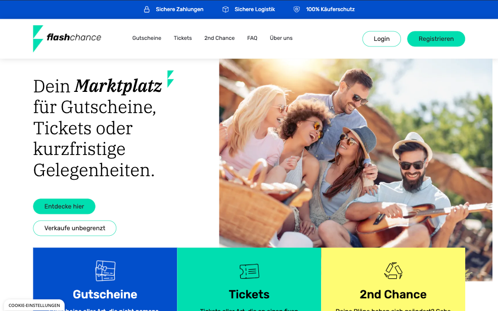 Flash Chance ist eine innovative und sichere Online-Plattform, die es Nutzern ermöglicht, Gutscheine, Tickets und besondere Erlebnisse auf einfache Weise zu kaufen und zu verkaufen. Sie hilft dabei, ungenutzte Ressourcen sinnvoll weiterzuvermitteln und gleichzeitig attraktive Deals zu nutzen. Die Plattform vereint die Möglichkeit, für verschiedene Event- und Erlebnisangebote günstige Gelegenheiten zu finden, die anderweitig verfallen könnten, und fördert so einen nachhaltigen Umgang mit Ressourcen.