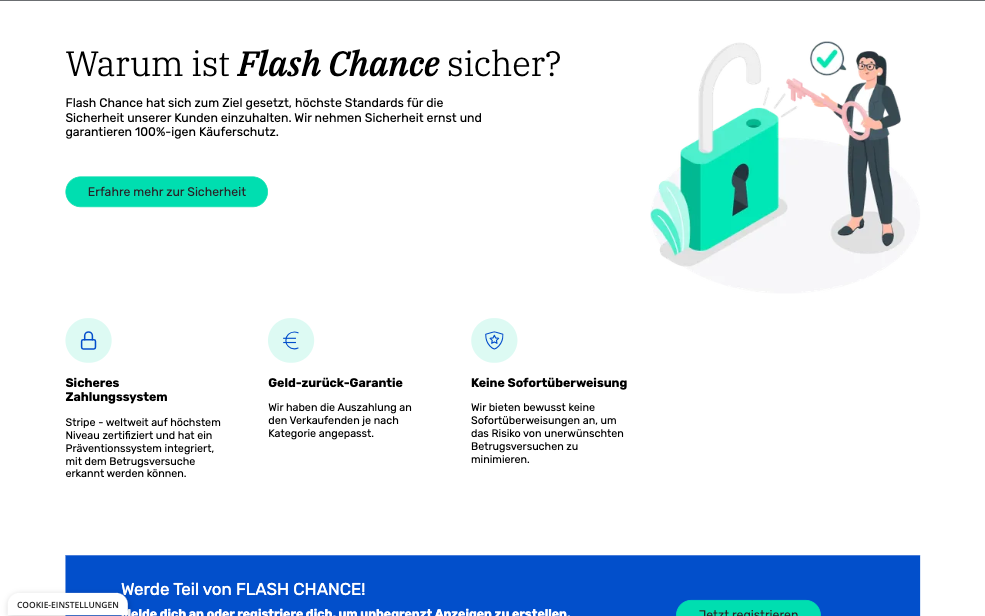 Für die Zahlungsabwicklung verwendet Flash Chance Stripe, einen der führenden Anbieter für Online-Zahlungen. Stripe sorgt für sichere Transaktionen und bietet eine breite Unterstützung für verschiedene Zahlungsmethoden. Dank der Integration von Stripe können Käufer und Verkäufer auf Flash Chance sicher und unkompliziert Transaktionen durchführen. Die Plattform setzt auf eine SSL-verschlüsselte Verbindung, um die Sicherheit der Daten zu gewährleisten.
