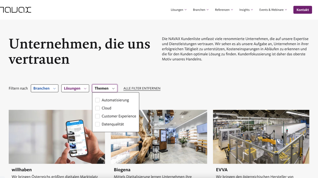 Auch interaktive Elemente wie Call-to-Actions, Filter oder Kontaktmöglichkeiten wurden so platziert, dass sie zur jeweiligen Nutzungsphase passen und nicht ablenken, sondern unterstützen. Die Seitenstruktur folgt den Erwartungen der Zielgruppe und stellt Inhalte wie branchenspezifische Lösungen, aktuelle Webinare oder Whitepaper direkt und ohne Umwege zur Verfügung.